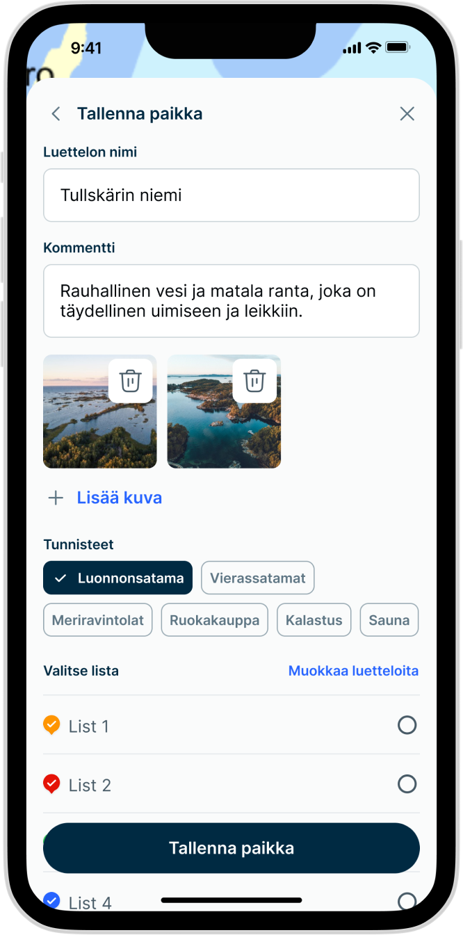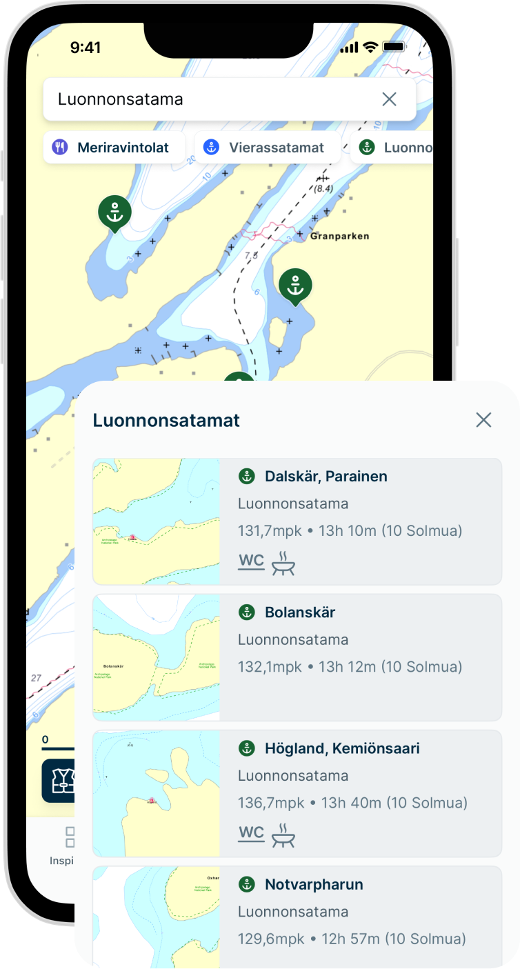 Kun lataat sovelluksen ja luot tilin, saat ilmaisen pääsyn yleismerikarttaamme (HUOM! Ei navigointiin), tietoa AIS-veneistä ja mahdollisuuden etsiä satamia, saaristoravintolaita ja veneasemia. Lisäksi voit tallentaa ja jakaa sijainteja sekä inspiraatiota retkikohteista ystävillesi.